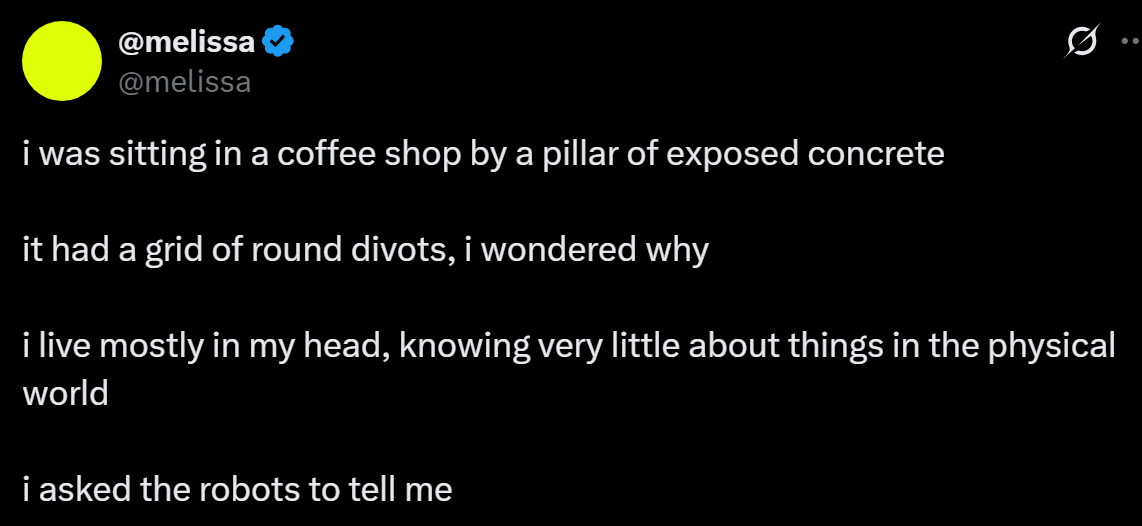 For a moment, I was seduced. @melissa’s AI use had clearly not corroded the poetry of her worldview. Perhaps I, too, could ask the robots for something that would beautify my day. Perhaps I could summon a genius.