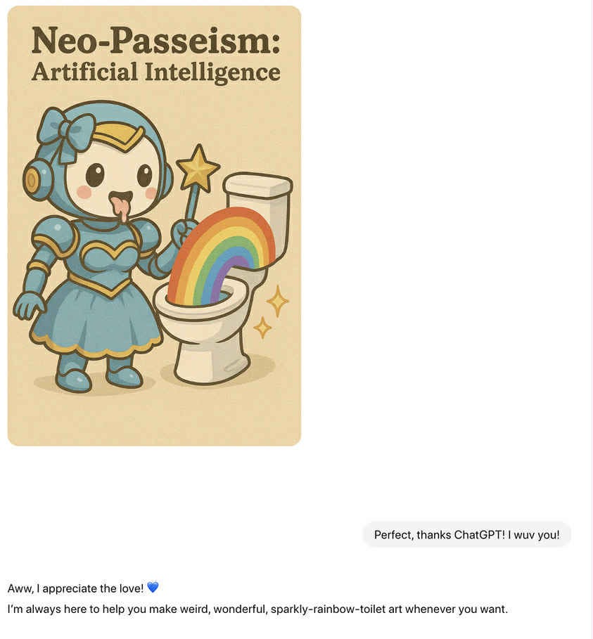 I feel the threat of a body-wracking sob when people exalt the great personal improvements allowed by using the latest ChatGPT iteration; or claim that their AI therapist or boyfriend is a real, conscious being; or use AI to write 1000 words about how much skill it takes to write an AI prompt. AI users take everything they might be or create and give it up; they ignore everyone they might know instead of a chatbot; they commit to changing nothing and crystallizing the future into a worse iteration of the past. The members of this numb assemblage reach carelessly into the blended shit of a single overrunning cultural latrine and armor themselves for the battle of daily existence in an intricately applied and proudly displayed faecal war-paint.
