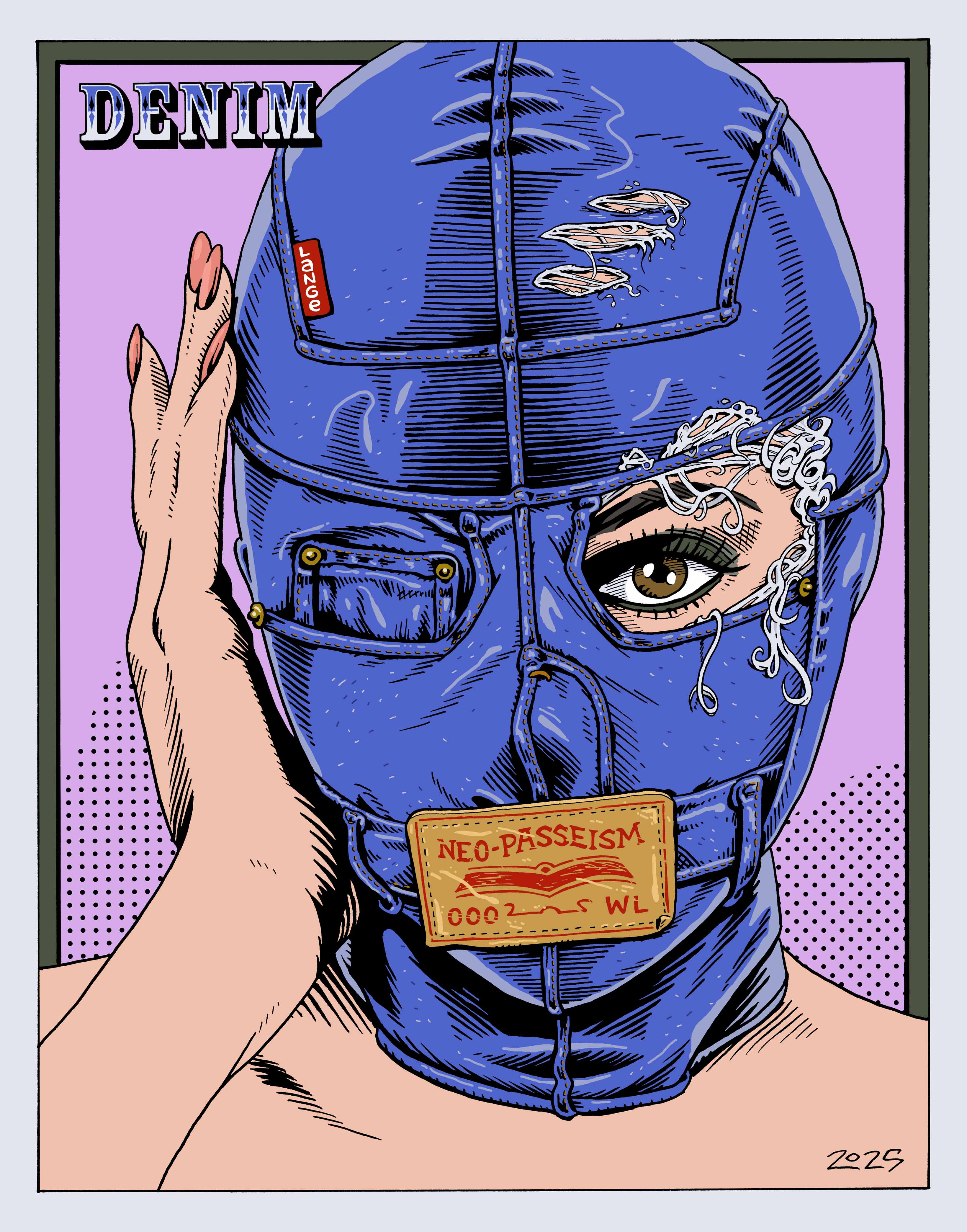 "Judging blue jeans' inherent erotics against leather's, Terence Sellers (writing as Mistress Angel Stern in THE CORRECT SADIST) decrees: ‘Denim vies for a place on the throne near it, but it is too common, too cheap.’ Dominatrix dogma, perhaps, but the matter of discipline—or denim's evasion of it—goes precisely to today's dilemma. If bull skin comes with a bestial aegis, under the aegis of what or whom—forty triple-pleated, acid-washed, pre-faded, pre-slashed years since Sellers' appraisal—do Levi's et al. protect? Jerry Seinfeld's? Steve Jobs'? My Dad's? Your Mom's? I don't know... Ask a Neo-Passéist!"