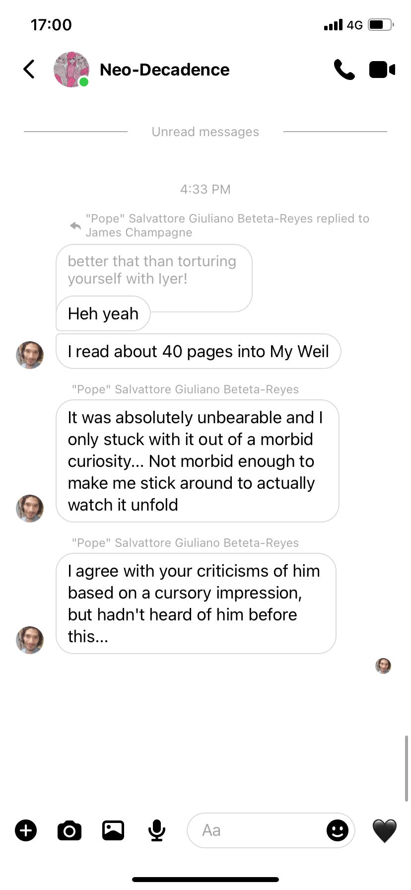 Iyer’s prose reaches its nadir in his most recent work, My Weil (2023). As the title indicates, this time it’s Simone Weil’s turn to be siphoned for second-hand significance; presumably the recent spate of Huysmans Flips and other retrograde spiritual contortions has moved her to the front of the queue. All the flaws of the previous works are magnified here, with Iyer seemingly having given up on even trying to write at an adult level. The novel as published feels like a rough draft, sloppily sketched out in a lazy, Young Adult-style narrative shorthand of fragments and dangling, disconnected gerunds. Subclauses have been abandoned. It is written in the present tense, because Iyer is nothing if not an academic, and this is the default “workshop” style of the past thirty or forty years.